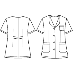 Jaqueta de senhora. Frente: Bandas, sem gola, abotoadura central, decote em vê, dois bolsos de chapa em baixo metidos nas costuras laterais um bolso pequeno do lado esquerdo à altura do peito, pinças nas laterais, ao alto. Atrás: costas compostas de duas partes ligadas por costura central ao alto, cintadas, uma pinça de cada lado ao alto, cinto pequeno metido entre pinças. Meia manga cava normal. Aplicações de cor lisa a condizer nas vistas dos bolsos, no cinto atrás, bandas e nas meias mangas. Combina com a calça ASCL201.