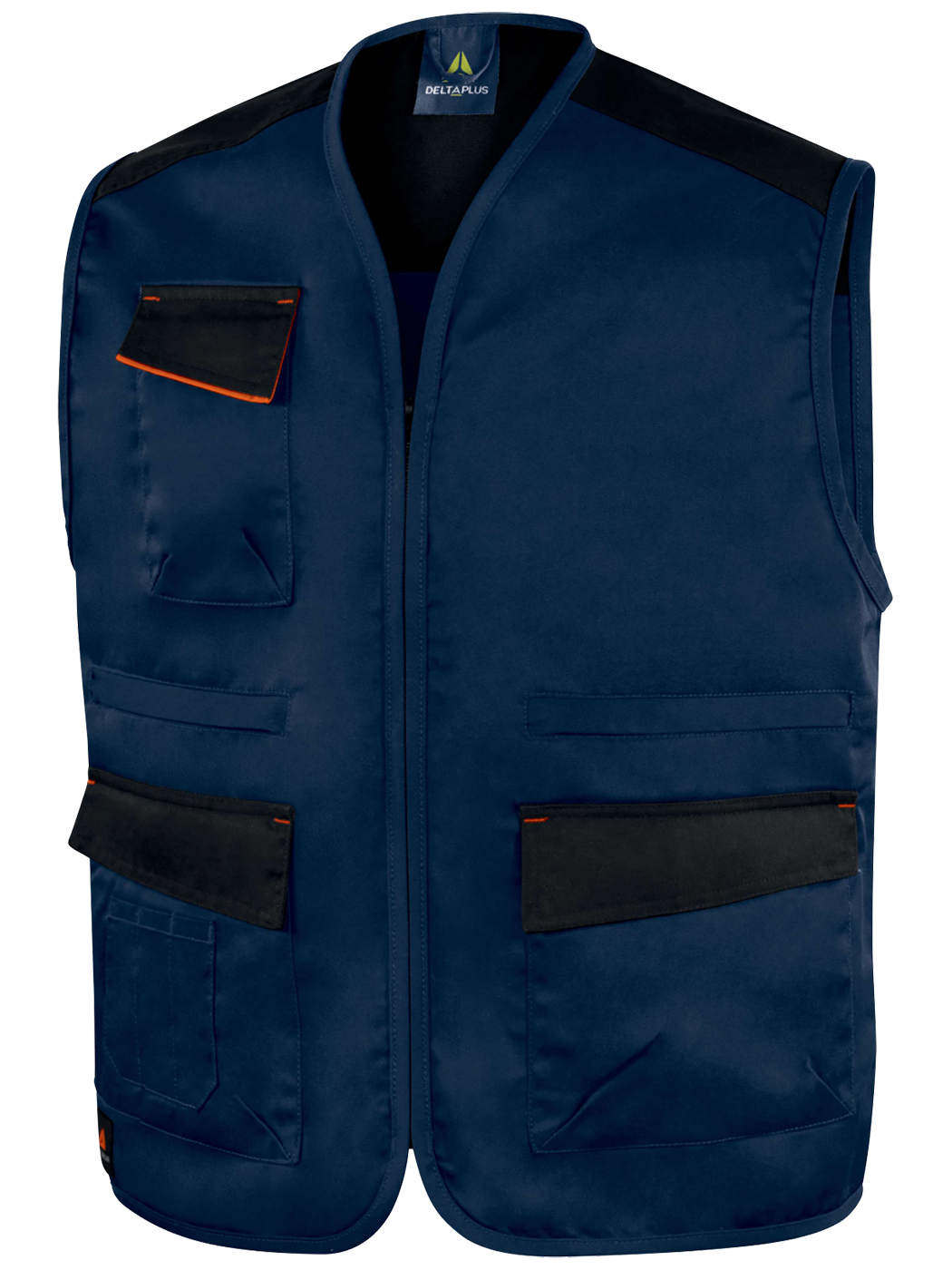 Colete de trabalho universal, elegante. Bolsos exteriores : 2 bolsos com fecho de correr - 2 bolsos com aba - 1 bolso para telefone - 1 bolso para caneta. Gola em V Fecho de correr coberto para evitar os risco de estrias EN ISO 13688