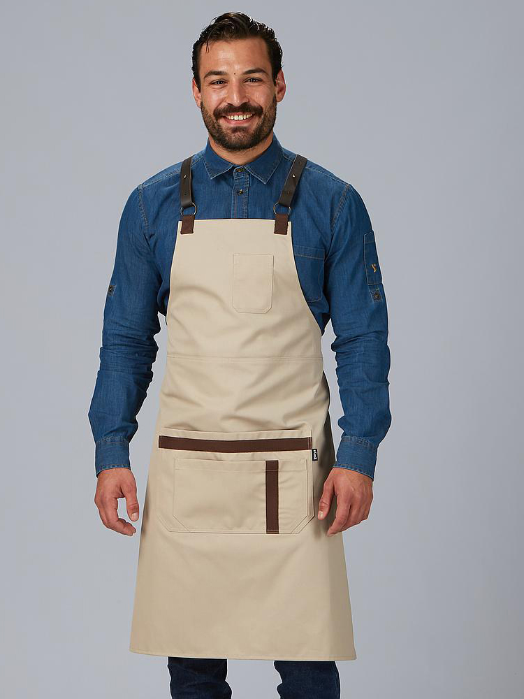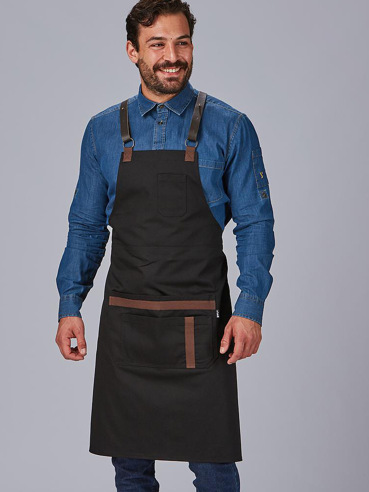 Avental com acessórios em couro é a escolha perfeita para os profissionais da hotelaria e restauração que procuram uma peça de vestuário duradoura, elegante e funcional. O seu design com fechos ajustáveis por meio de tiras em espinha de peixe nas ancas e tiras de couro no pescoço permite um ajuste confortável e personalizado, garantindo mobilidade e conforto durante o dia de trabalho. Fabricado em SARJA 65% PES 35% CO (240 gr/m²), este avental combina durabilidade e conforto, sendo ideal para uma utilização intensiva em cozinhas, bares e restaurantes. Possui 1 bolso esquerdo no peito e 2 bolsos frontais, proporcionando uma arrumação prática para ferramentas e acessórios. O design é complementado por laterais reforçadas com peças triangulares de cor chocolate. Com um comprimento aproximado de 88 cm, este avental garante cobertura e proteção, sem restringir os movimentos. Disponível em preto, bege e azul petróleo, é uma opção versátil que se adapta a diferentes estilos e necessidades profissionais. * Design ergonómico e ajustável, graças ao seu sistema de fecho com tiras de espinha de peixe e tiras de couro. * Resistência e durabilidade, fabricada em sarja de alta qualidade. * Praticidade e funcionalidade, com 3 bolsos estratégicos. * Laterais reforçadas. * Disponível em 3 cores elegantes: preto, bege e azul petróleo, adaptando-se a diferentes ambientes de trabalho. * Comprimento de 88 cm, proporcionando uma excelente cobertura e proteção.