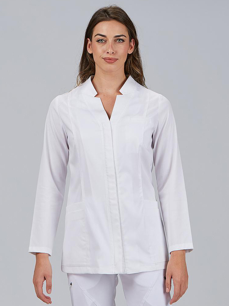 A bata ENOLA foi concebida para profissionais que procuram um uniforme elegante, funcional e confortável, sem abdicar do estilo. Ideal para setores como saúde, estética, farmácia, clínica ou bem-estar, esta peça destaca-se pelo seu corte favorecedor e detalhes que fazem a diferença. Confeccionada em tecido ECOLYPTUS SARGA 48% PES 48% LY 4% EA - 185 gr/m², oferece uma combinação perfeita de resistência, elasticidade e suavidade, com um excelente caimento que realça a silhueta. Além disso, o lyocell confere propriedades sustentáveis e um toque especialmente agradável. O design incorpora um colarinho com efeito de lapela invertida, mangas compridas e um fecho central com zíper oculto para uma estética limpa e profissional. Possui quatro bolsos frontais, incluindo um bolso com botão no peito esquerdo, que adiciona funcionalidade sem sobrecarregar o design. Na parte de trás, uma peça central com efeito de cinto define a cintura e confere um toque estruturado e feminino. O seu corte justo (M1) e comprimento de aproximadamente 75 cm garantem uma silhueta elegante e confortável para o dia a dia. - Colarinho com efeito de solapa invertida. - Manga comprida. - Fecho central oculto. - 4 bolsos na frente e bolso com casa de botão no peito esquerdo. - Peça central com efeito de cinto nas costas. - 75cm aprox. | M1 JUSTA.