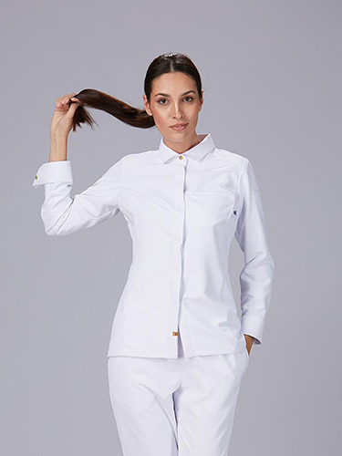 A sua elegante gola italiana, com o primeiro botão visível e os restantes ocultos, e os punhos subidos conferem um toque de distinção e profissionalismo. O encaixe e as costuras à frente e atrás conferem estilo e estrutura à peça. Os bolsos com cano no peito e nas mangas oferecem funcionalidade sem perder a estética.
