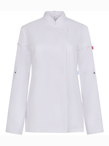 Design de conforto feminino Tecido com tratamento antibacteriano e repelente de líquidos Costas com tecido Coolmax® respirável Fecho de correr central com botões automáticos ocultos Gola padre com fita para avental Fita interior para pendurar Aberturas nas laterais Manga alfaiate dobrável com abertura de punho com fita e botão automático Fita na manga direita para pendurar acessórios de chef Bolso na manga esquerda com elástico para acessórios