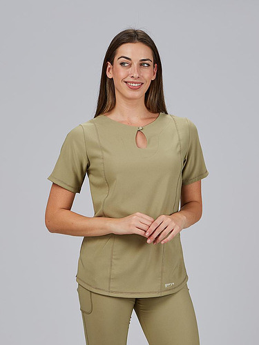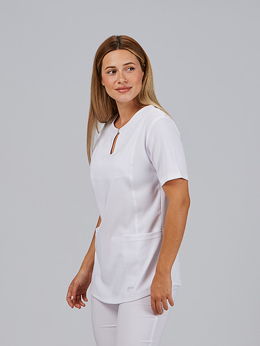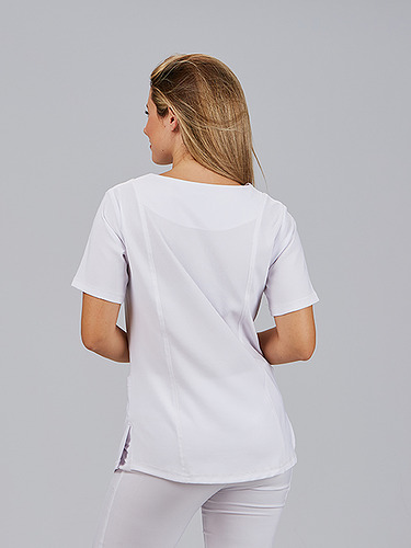 A jaqueta feminina Maria é uma peça leve, funcional e com um design cuidado ao detalhe, perfeita para profissionais que procuram conforto sem abdicar de uma imagem elegante. O seu decote redondo com abertura em forma de lágrima e botão decorativo acrescenta um toque elegante e feminino ao uniforme diário.