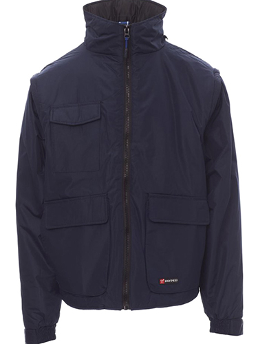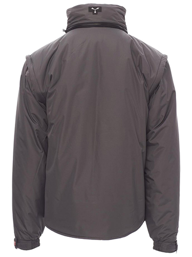Blusão de homem, mangas destacáveis, fecho de correr de 8 mm em plástico e cursor de metal, capuz oculto na gola, punhos elásticos, dois bolsos dianteiros LOCK SYSTEM espaçosos, dois bolsos laterais, bolso no peito para telemóvel. Interior: acolchoado
