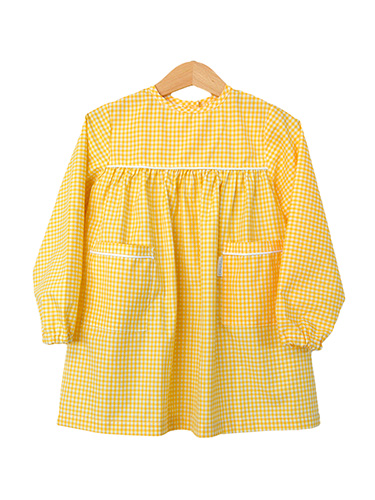 Bibe de criança, abotoar atrás, decote redondo sem gola, cabeção atrás e à frente, saia inteira franzida, punho da manga com elástico.