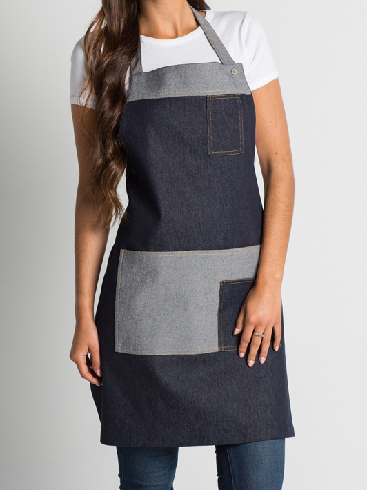 Delantal peto envolvente fabricado con tejido 'tejano'.