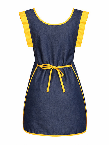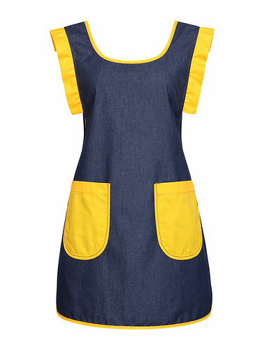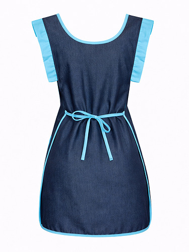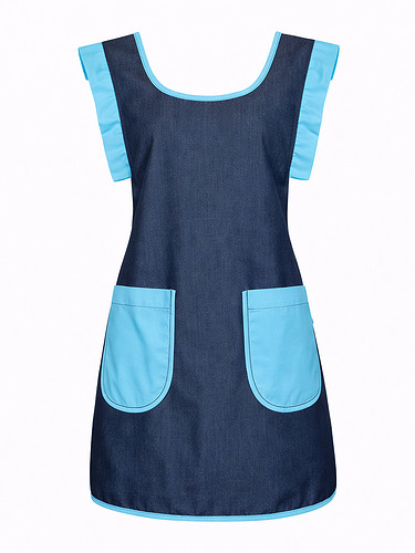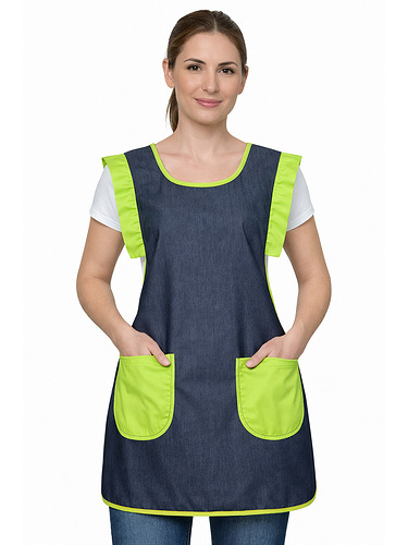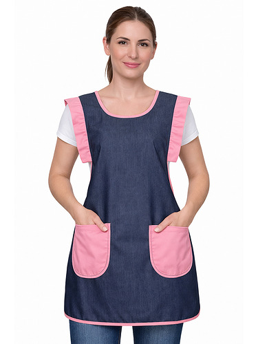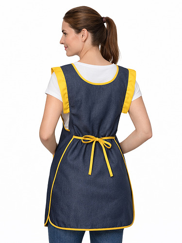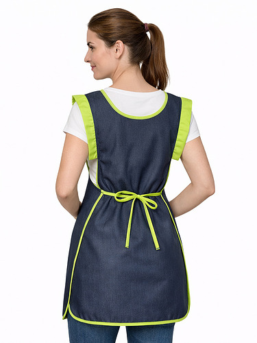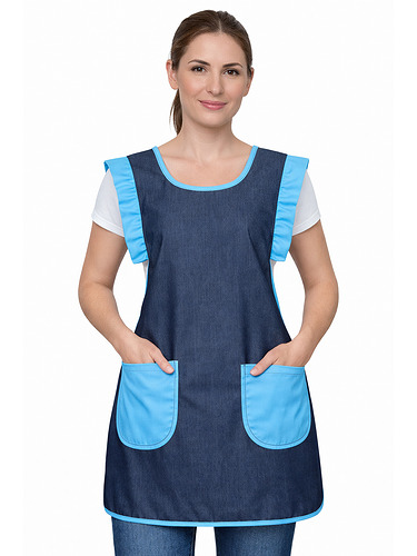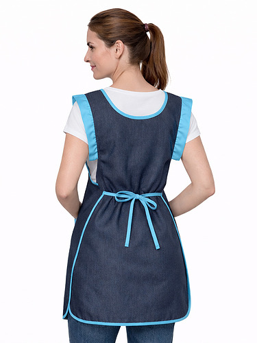 Avental duplo (frente e costas), tecido resistente e easy-care polyester/viscose com efeito indigo (visual tipo ganga).