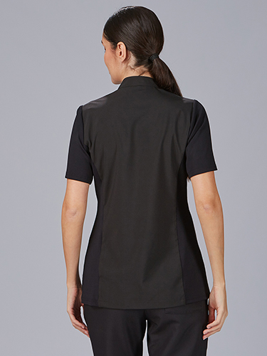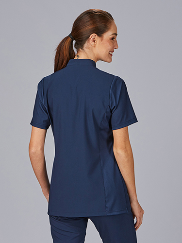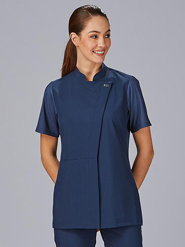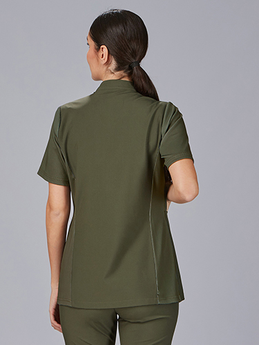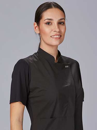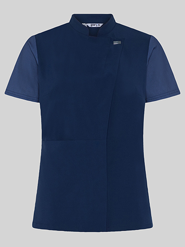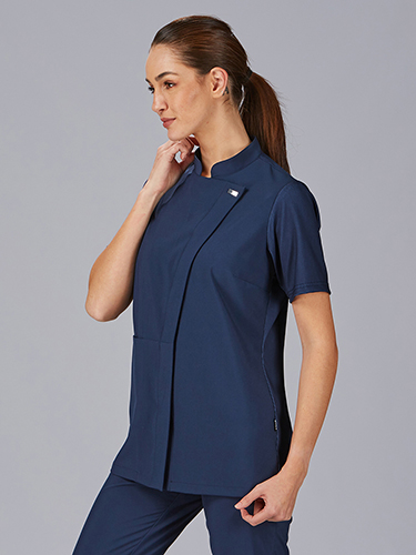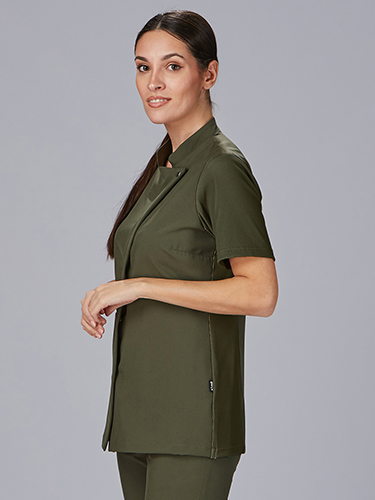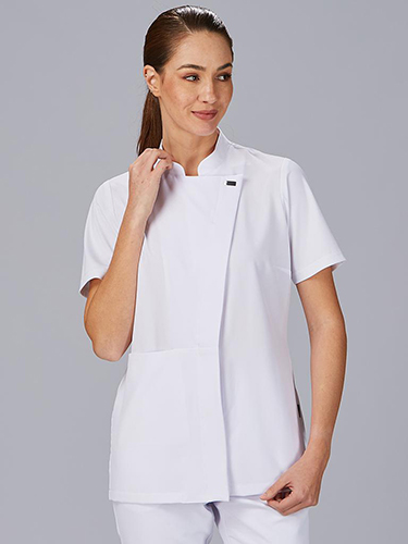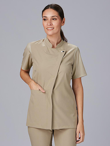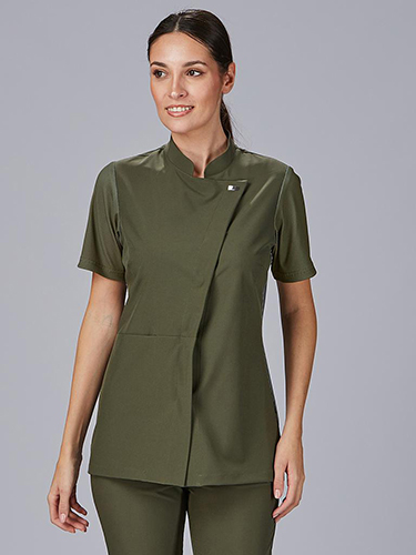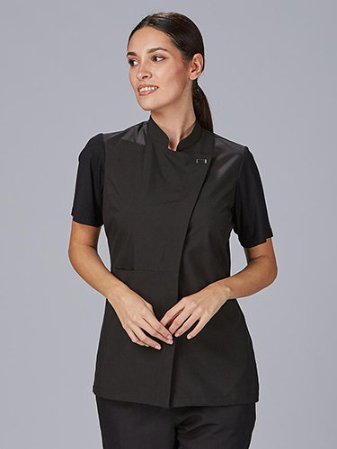 * Fecho frontal cruzado com botões ocultos, para uma estética profissional e elegante.