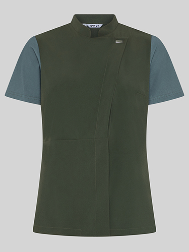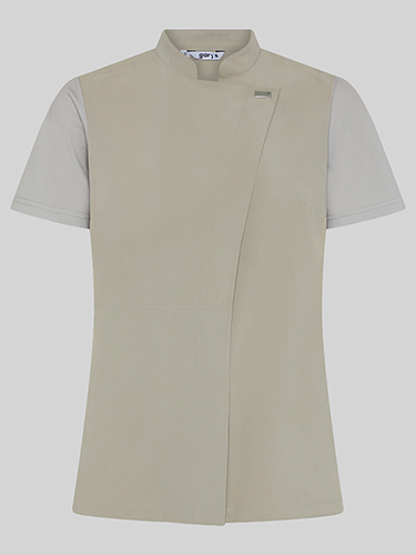 O seu design semi-ajustado adapta-se à silhueta sem sacrificar o conforto. Destaca-se pelo seu fecho cruzado (direita sobre esquerda quando vestido), com o primeiro botão visível e os restantes ocultos, o que proporciona um acabamento limpo e elegante. Também apresenta nervuras nos lados e nas mangas, melhorando a elasticidade e o ajuste.