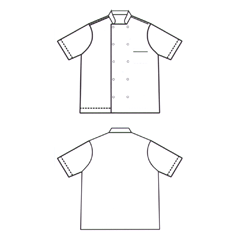 Parte da frente: Direita; fecho lateral com 10 colchetes; bolso de chapa com vivo em parte da frente esquerda. Costas: Direitas. Manga: Curta. Colarinho: De tira com vivo.