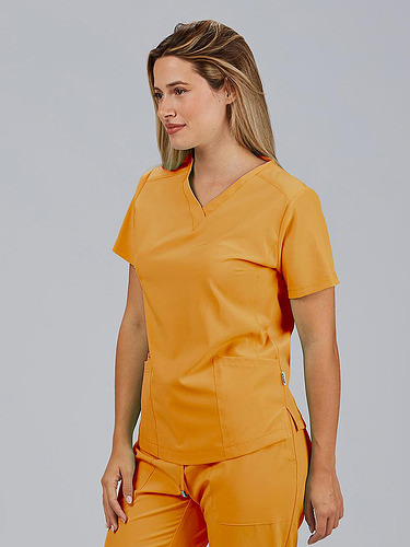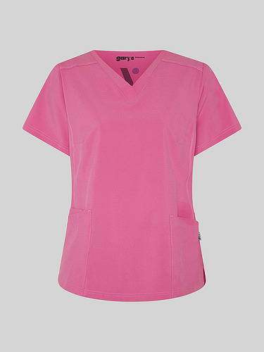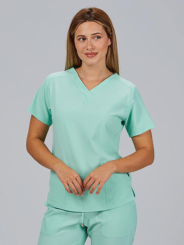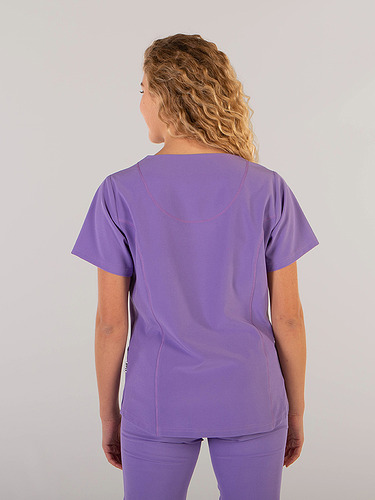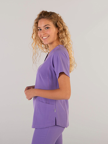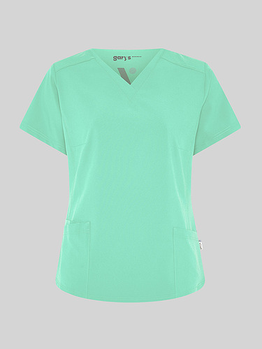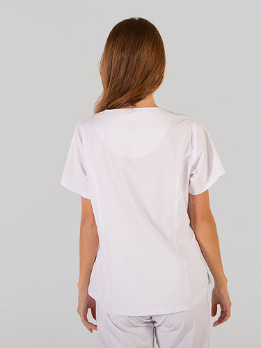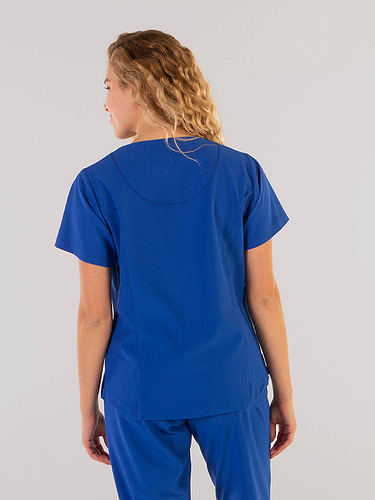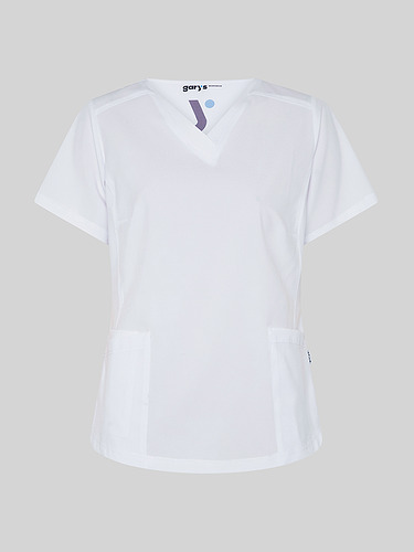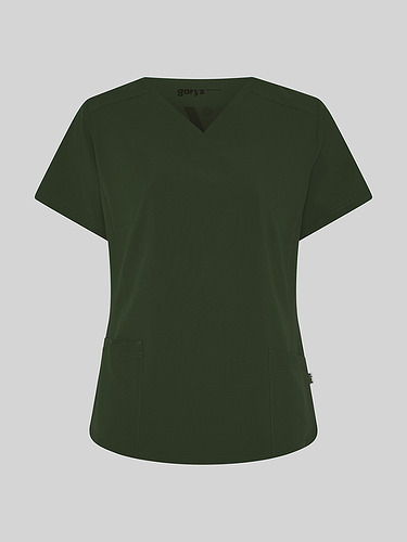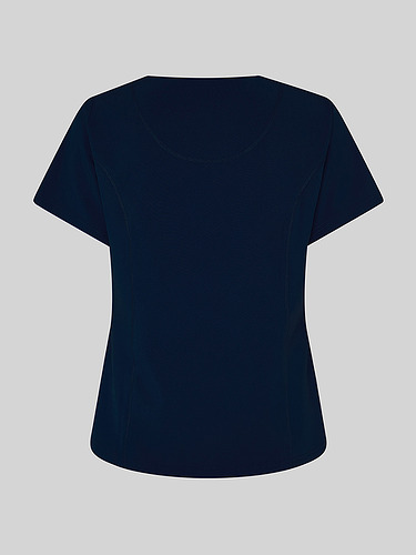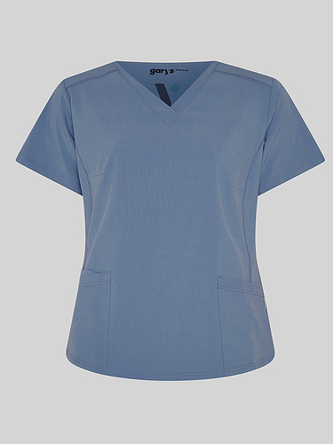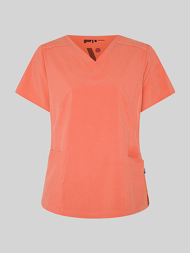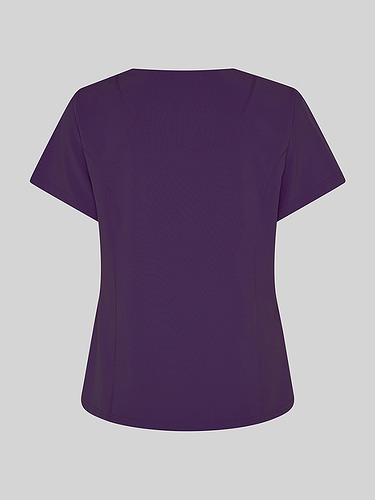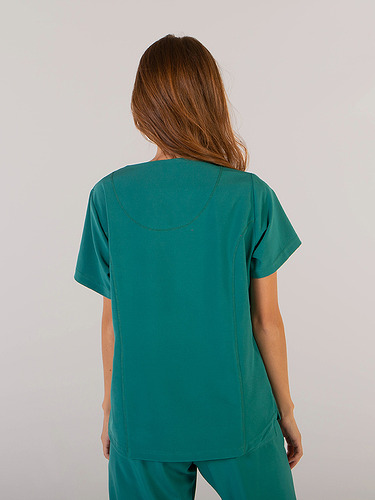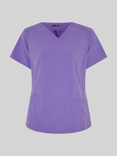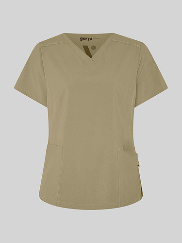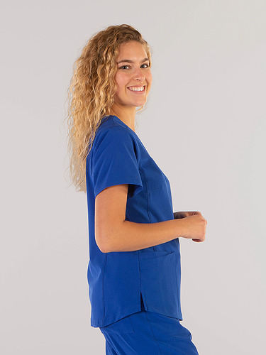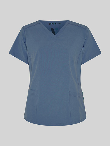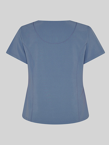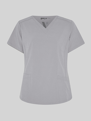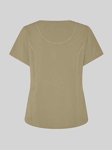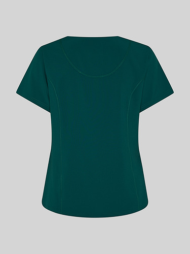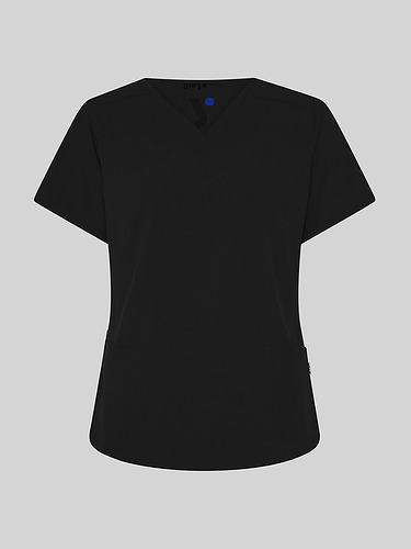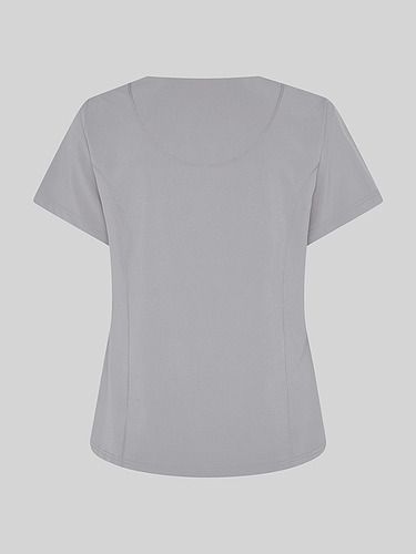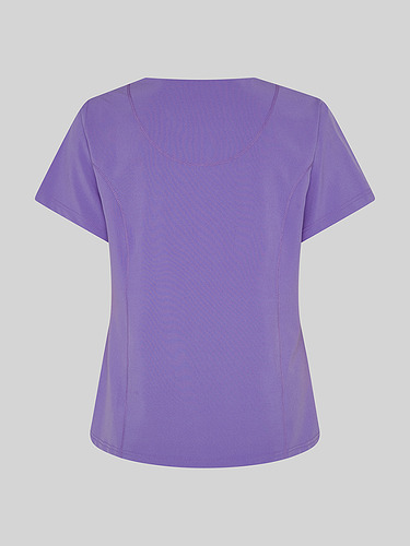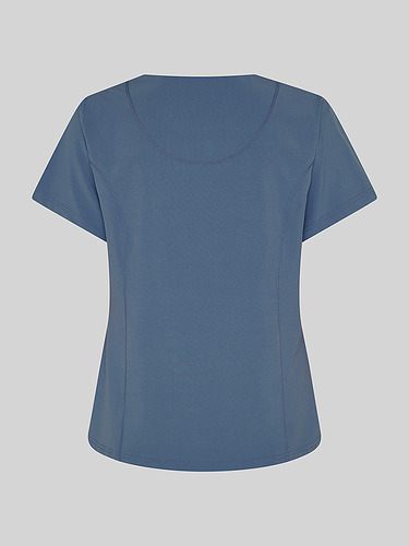 Com mangas curtas e gola em V, esta blusa oferece funcionalidade com três bolsos frontais, incluindo dois no lado direito. O seu design semi-ajustado, com costuras nas laterais da frente e nas costas, pinças no peito e aberturas laterais, proporciona conforto e mobilidade.