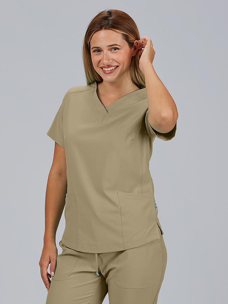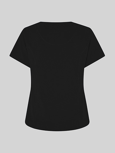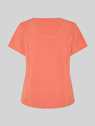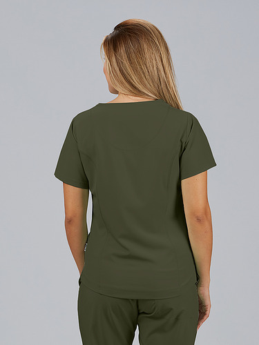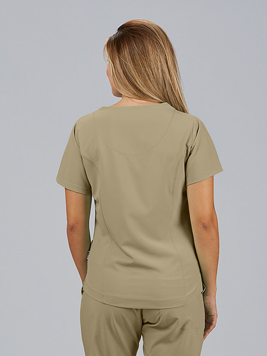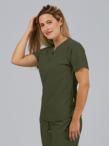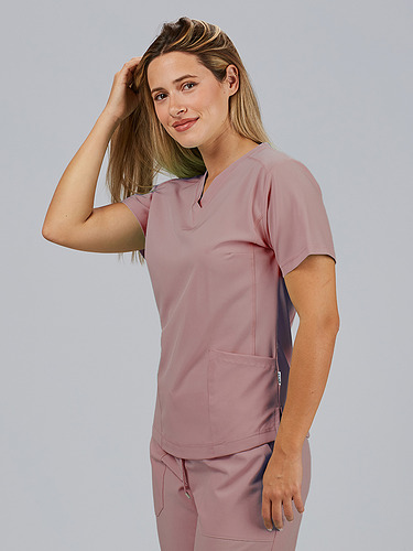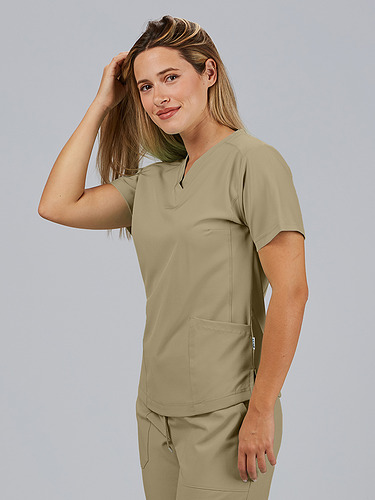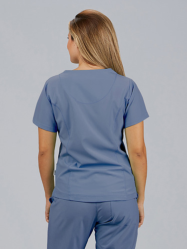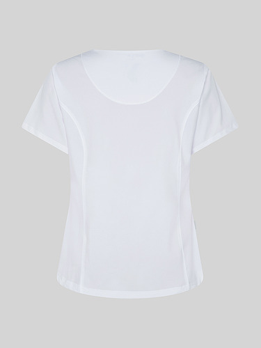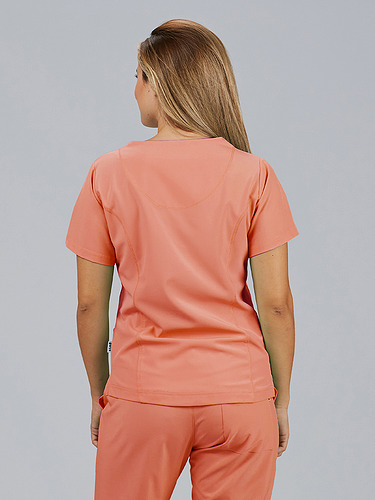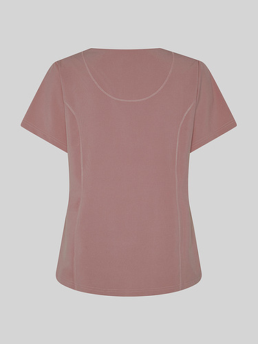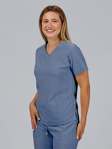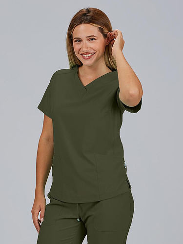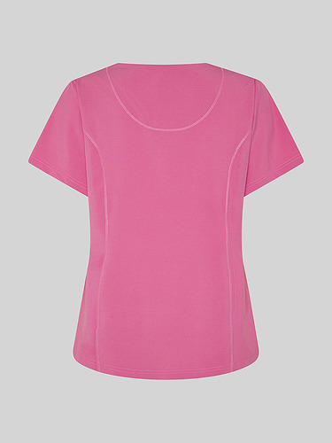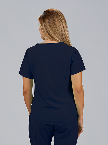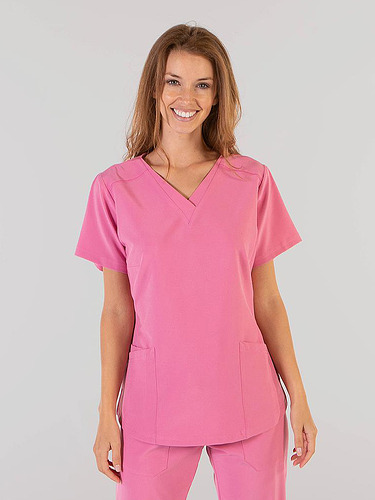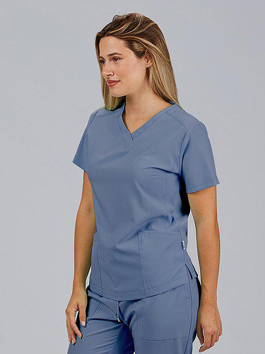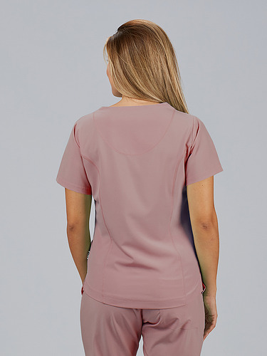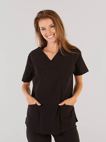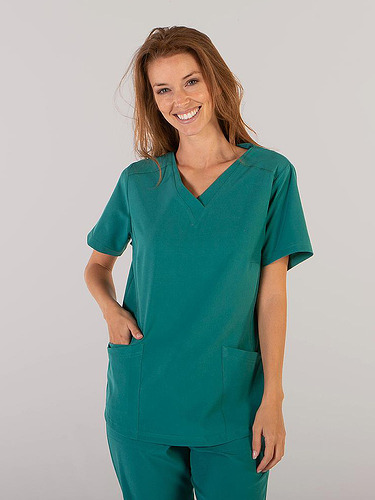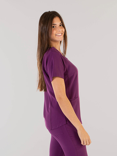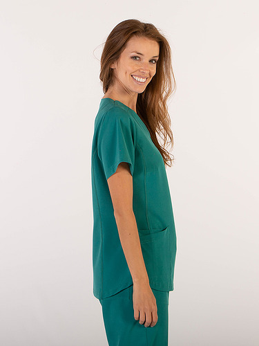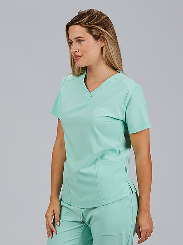 Com mangas curtas e gola em V, esta blusa oferece funcionalidade com três bolsos frontais, incluindo dois no lado direito. O seu design semi-ajustado, com costuras nas laterais da frente e nas costas, pinças no peito e aberturas laterais, proporciona conforto e mobilidade.