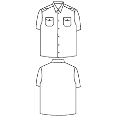Parte da frente: Direita; fecho central com 7 botões; 2 bolsos de chapa com paleta e botão à L da medida do peito. Costas: Direitas. Manga: Pregada curta. Decote: Camiseiro.