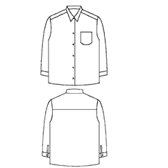 Parte da frente: Direita; fecho central com 6 botões; 1 bolso de chapa à L da medida do peito esquerdo. Costas: Direitas; corpo. Manga: Pregada; comprida; punho aberto com 1 botão. Decote: Camiseiro.