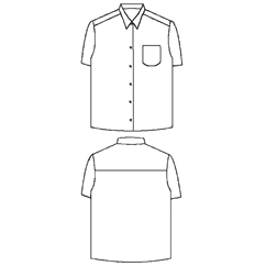 Parte da frente: Direita; fecho central com 6 botões; 1 bolso de chapa à L da medida do peito esquerdo. Costas: Direitas; corpo. Manga: Pregada; curta. Decote: Camiseiro.