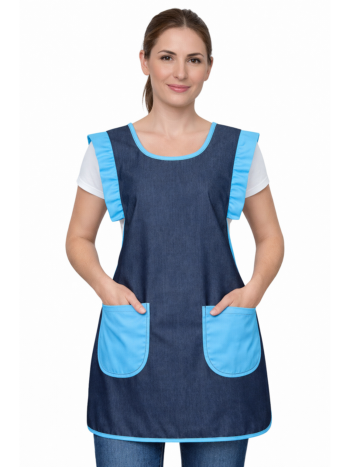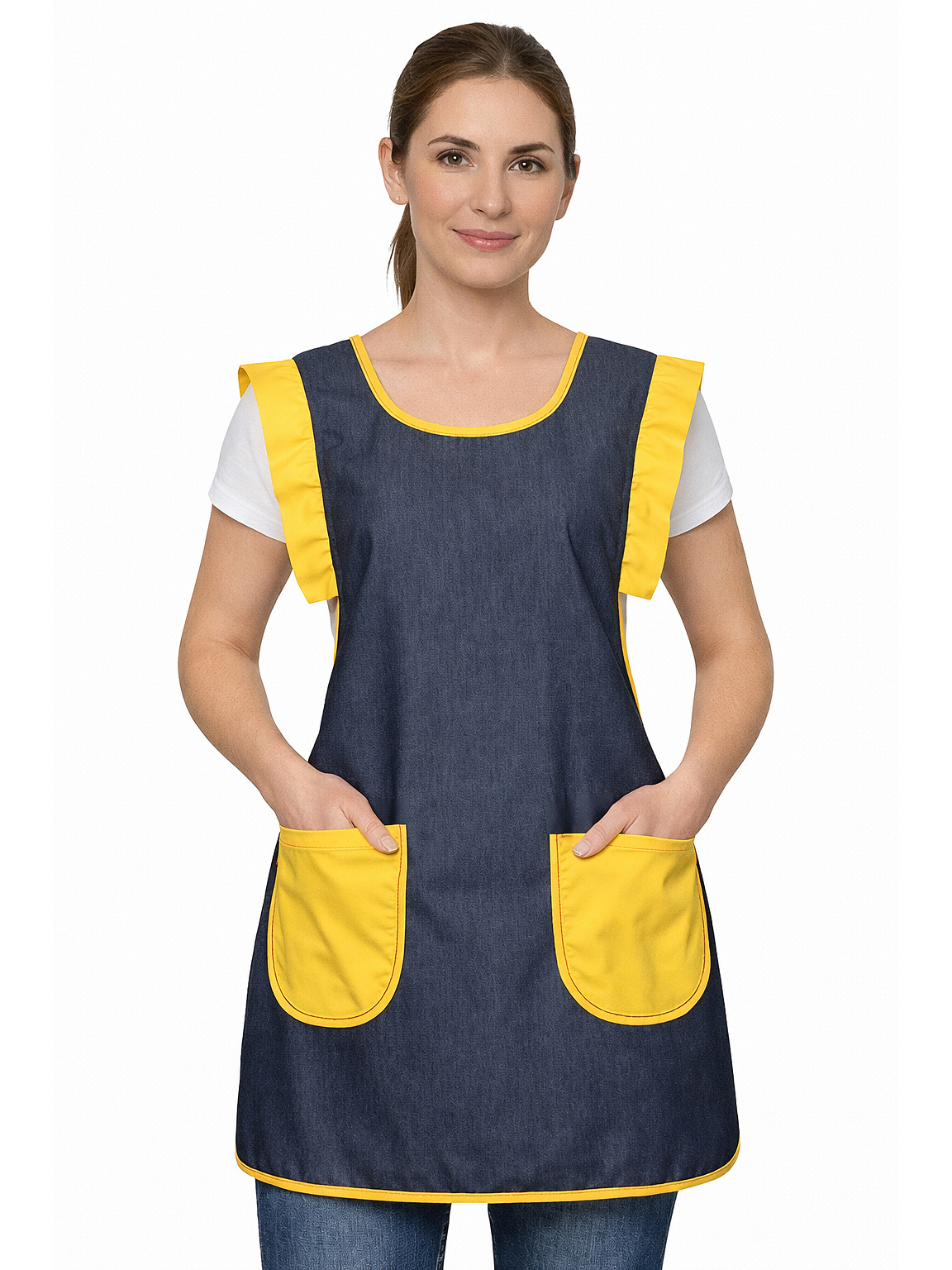 Avental duplo (frente e costas), tecido resistente e easy-care polyester/viscose com efeito indigo (visual tipo ganga). Com vivos em cor a condizer.